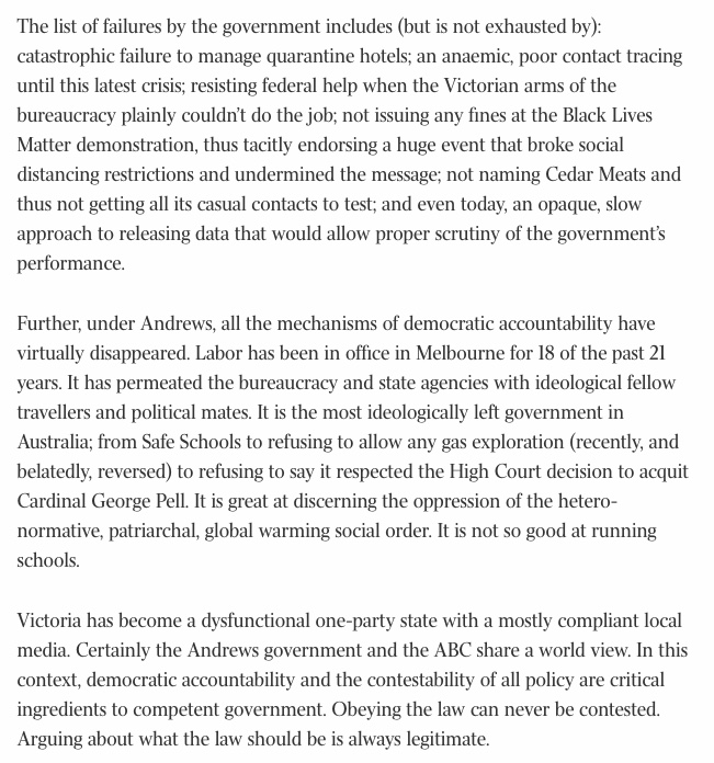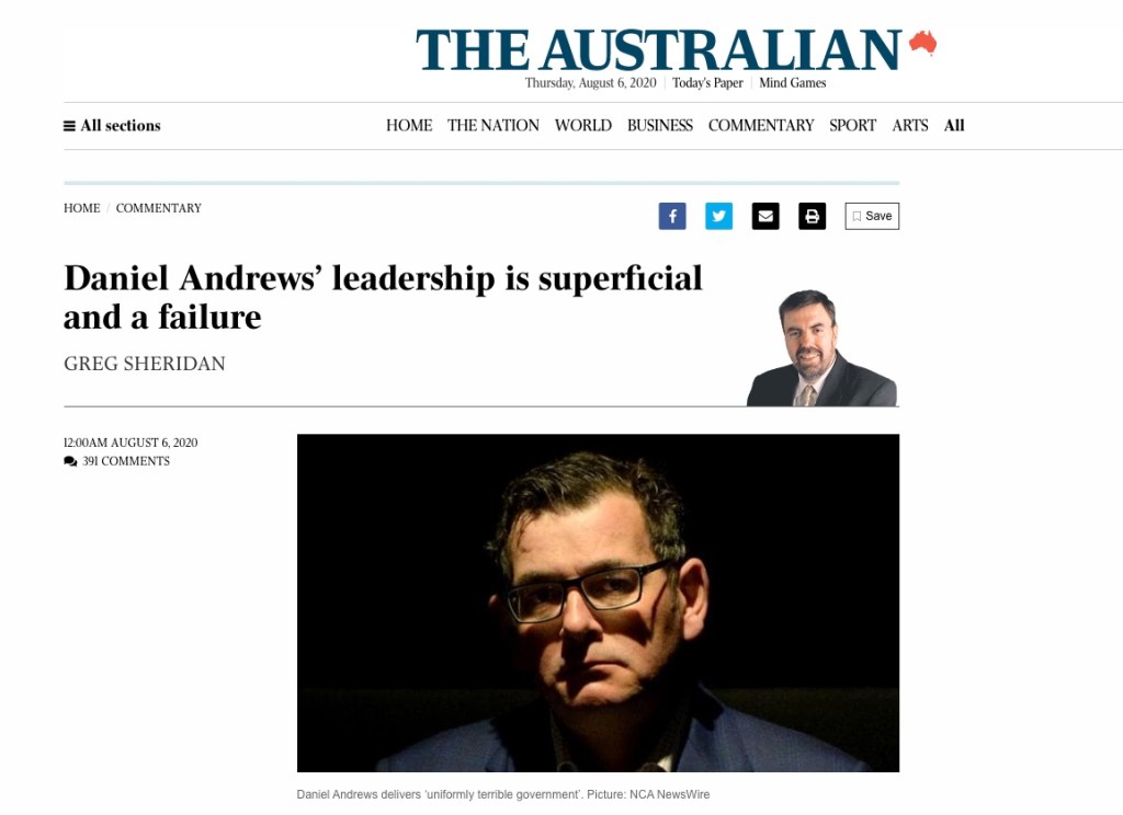 The State of Disaster declared by Premier Andrews will not have any effect on the COVID19 virus. Severity of lockdowns do not affect mortality outcomes, as many emerging studies of the northern hemisphere experience show. But Andrews’ suspension of democracy, the instant political disenfranchisement of the people, the social and economic catastrophe he has unleashed under the stamp of the heavy handed police state is not going unnoticed outside Victoria.