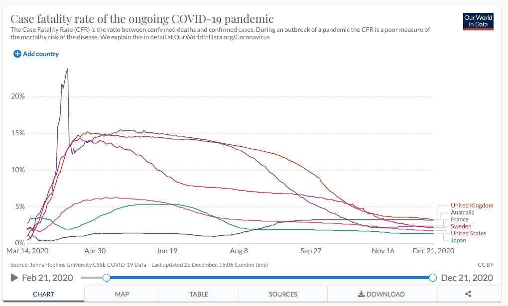 First, the case fatality rate has been falling after April in all countries except Australia. Australia is currently sitting second place (in this sample) for CFR.