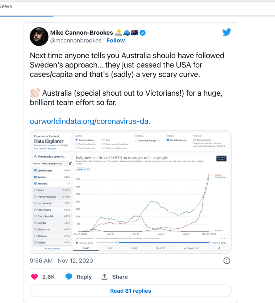 Or maybe not. He also assumed he knew a thing or two about pandemics. Here he is a lambasting Sweden for its public health response to Covid.