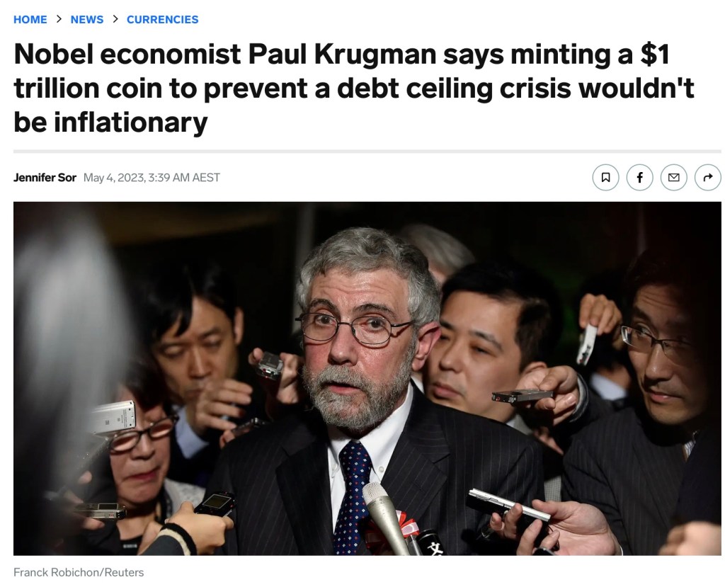 Krugman is getting more weird the older he gets. To my mind, if this would work for a 1 trillion coin, why be so stingy and mint only 1? Why not mint a 10 trillion coin and really get serious about withdrawing funds from the Fed and splash them all around? The Dems would have have invented magic money. Krugman doesn’t like to be challenged in public. He goes red in the face and blusters then accuses his interlocutors of not understanding economics. Consequently he severely limits public stage debates and sticks to friendly outlets such as the New York Times. On Twitter, he seems to write garbage and just ignore genuine counterpoints.