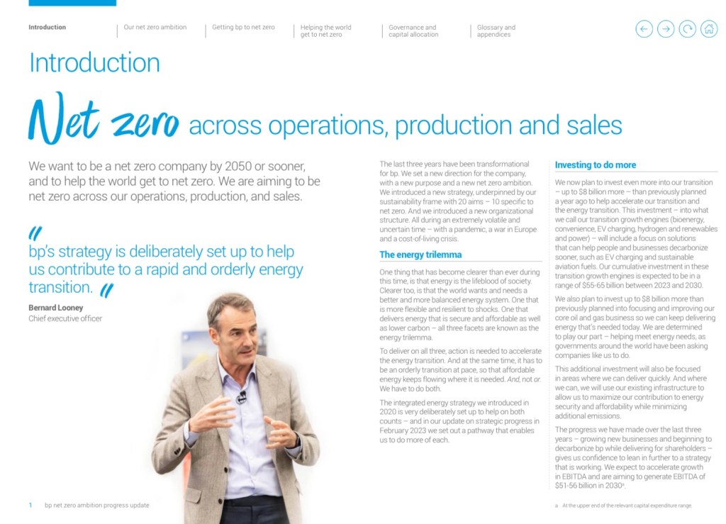 Here is an extract from the BP investors website reporting on net zero progress. This document, dated March 2023, is still on the website but my guess is not for long. Check it out: