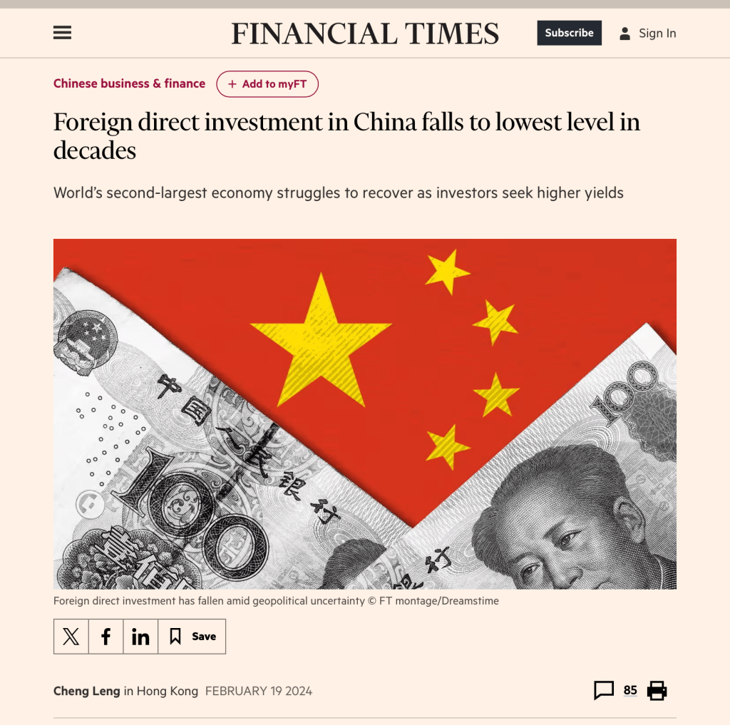 What foreign investor would want to invest in China today? The opportunities that arose from the relaxation of some communist controls have all been exploited. What is left is tougher pickings and the institutional, business and legal culture is not in the least familiar to a foreigner.