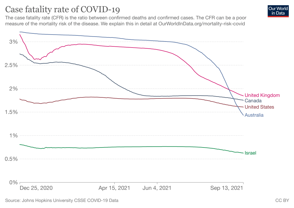 Israel’s case fatality rate (CFR) has been very stable, showing some reduction this month. There is no obvious associated reduction in CFR with rising vaccination penetration.