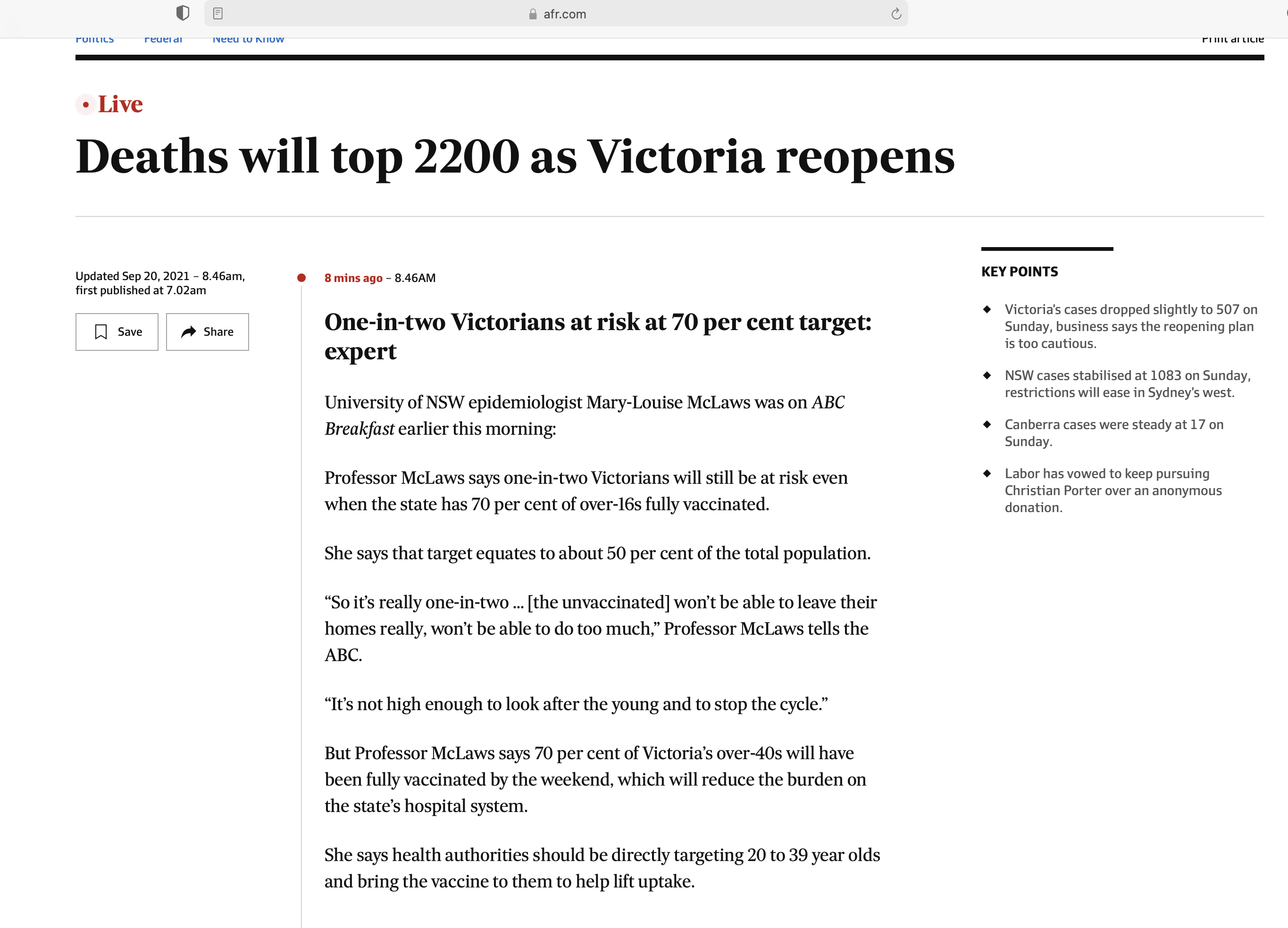 If the case numbers were much higher among the unvaccinated compared to the vaccinated, that would be helpful data to convince the public of the need for vaccination. If any readers know of the split, I’d appreciate a pointer to the data in the comments. Why the Australian state governments do not publish this is a mystery to me. Unless Occam’s Razor strikes again.