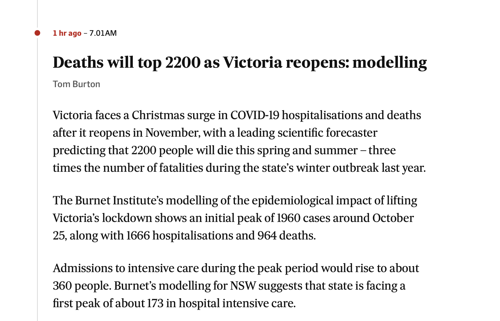 Readers may recall that I said the Burnet Institute’s COVID modelling from September 2021 should be revisited in late October to check the actual outcomes against the modelling predictions. It is now late October. The following actual data is sourced from covidlive.com.au