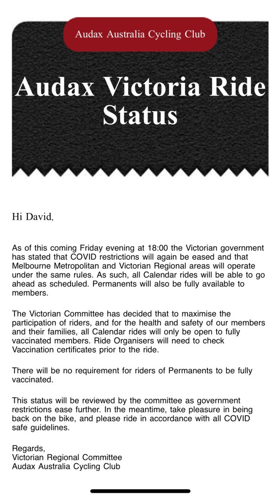 I received an email today from Audax Australia with some details about rides being opened up again in Victoria. The pith of the missive is shown below.